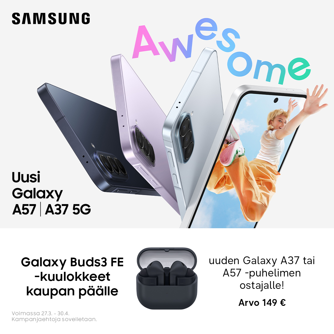 Ostaessasi Samsung Galaxy A37 tai A57 (SM-A376B/SM-A576B) -puhelimen, suos. hinta 429-619 euroa ("päätuote") 27.3. - 30.4.2026 välisenä
